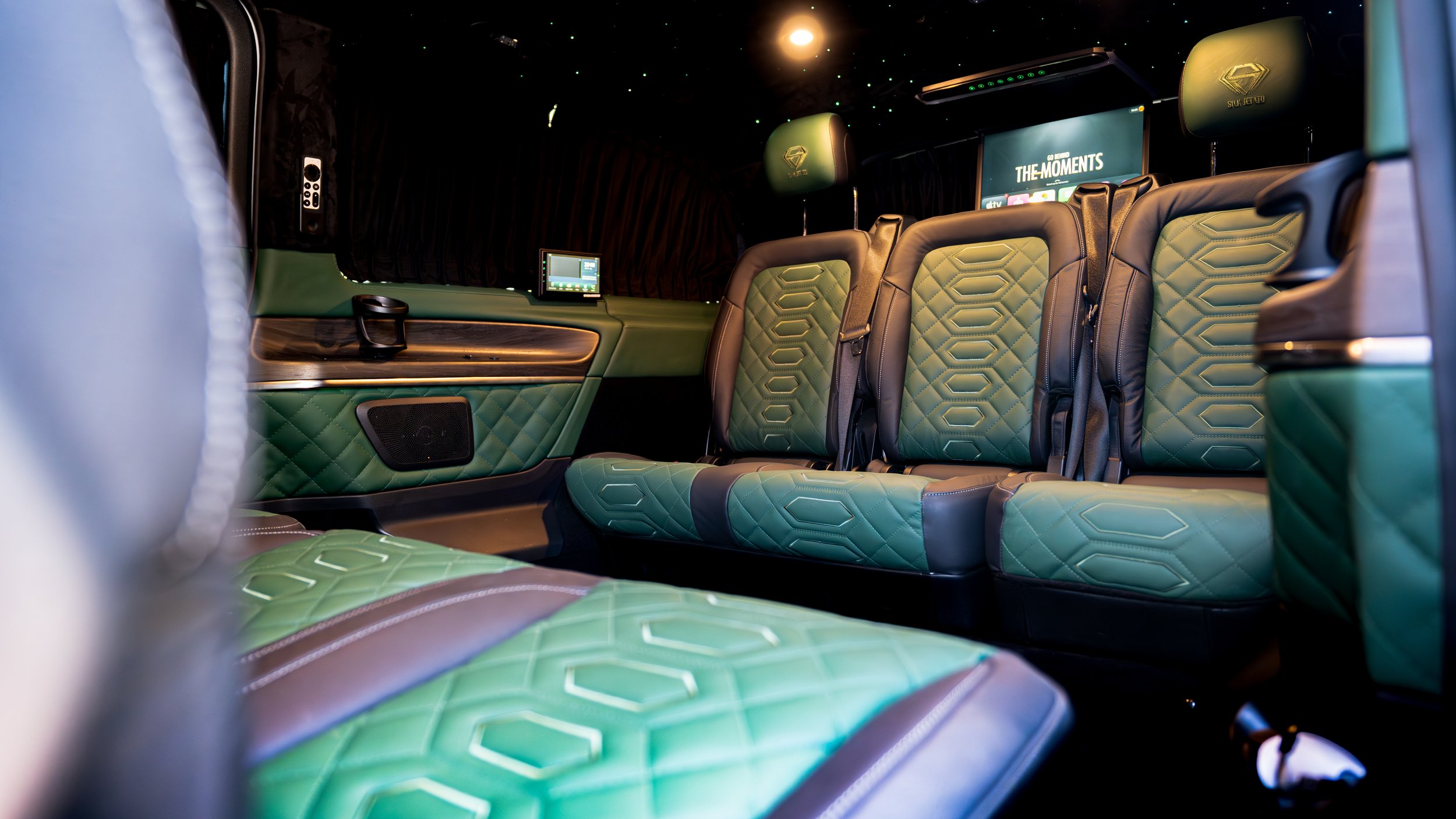 We offer bespoke vehicle enhancements—starlight ceilings, personalised headrests and tables, the latest technology, and premium sound systems that deliver an immersive experience.